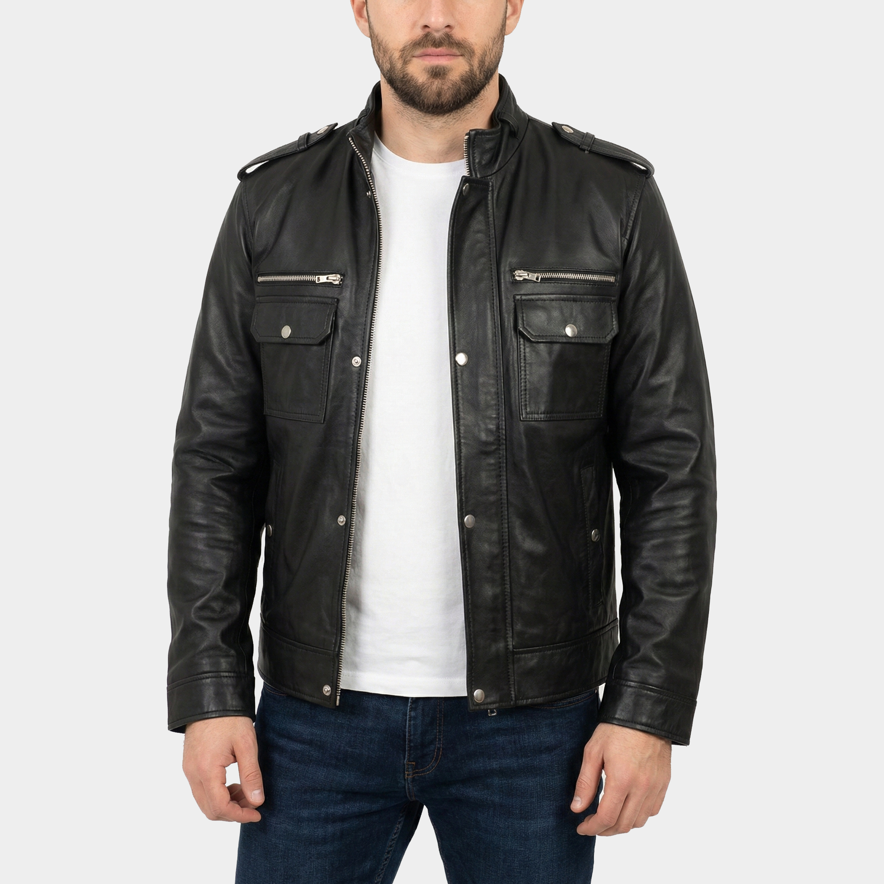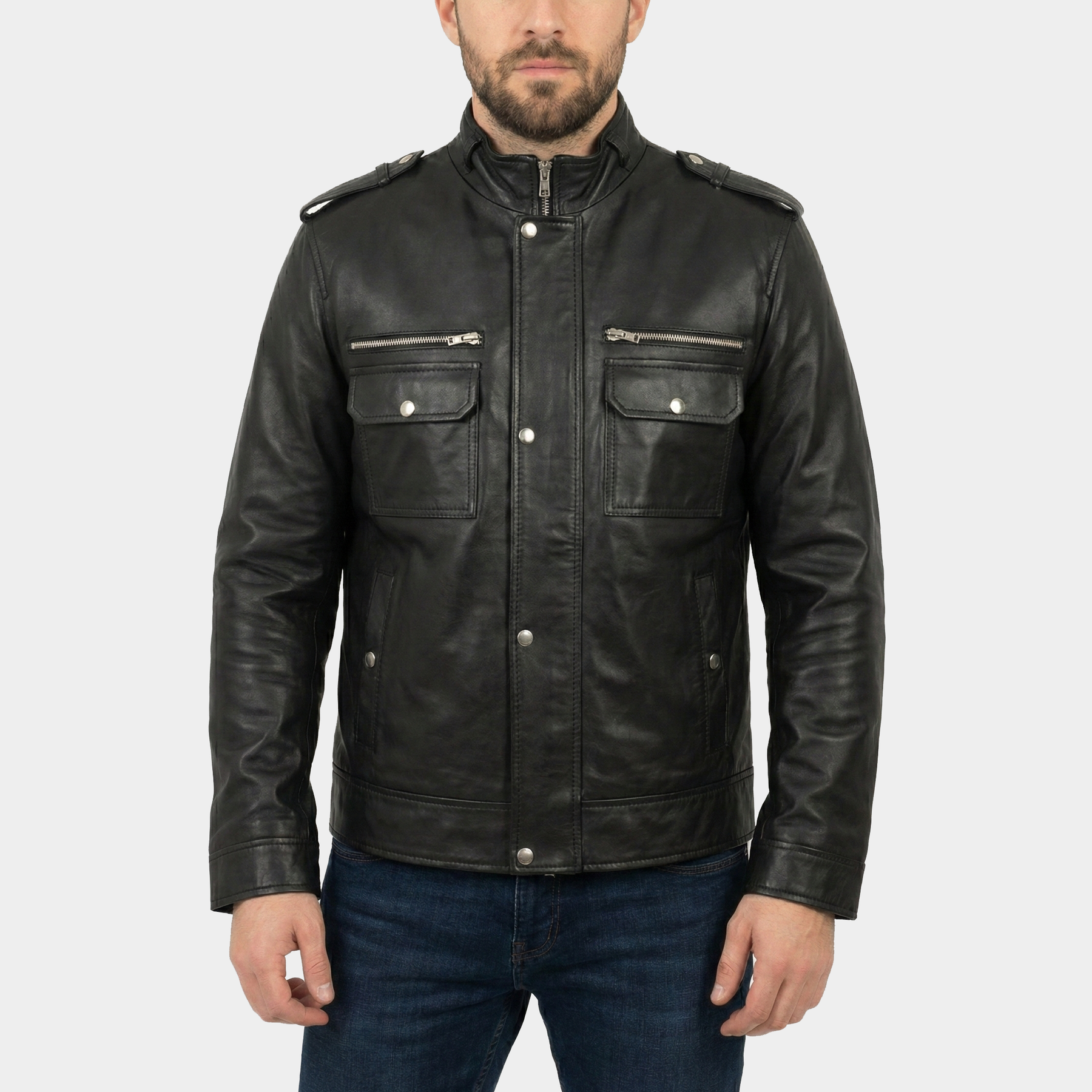 Details: Shoulder epaulettes, structured stand collar