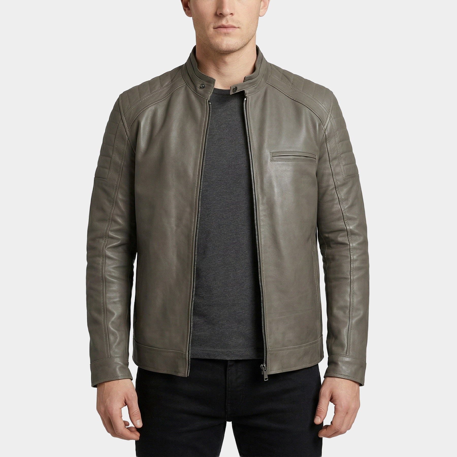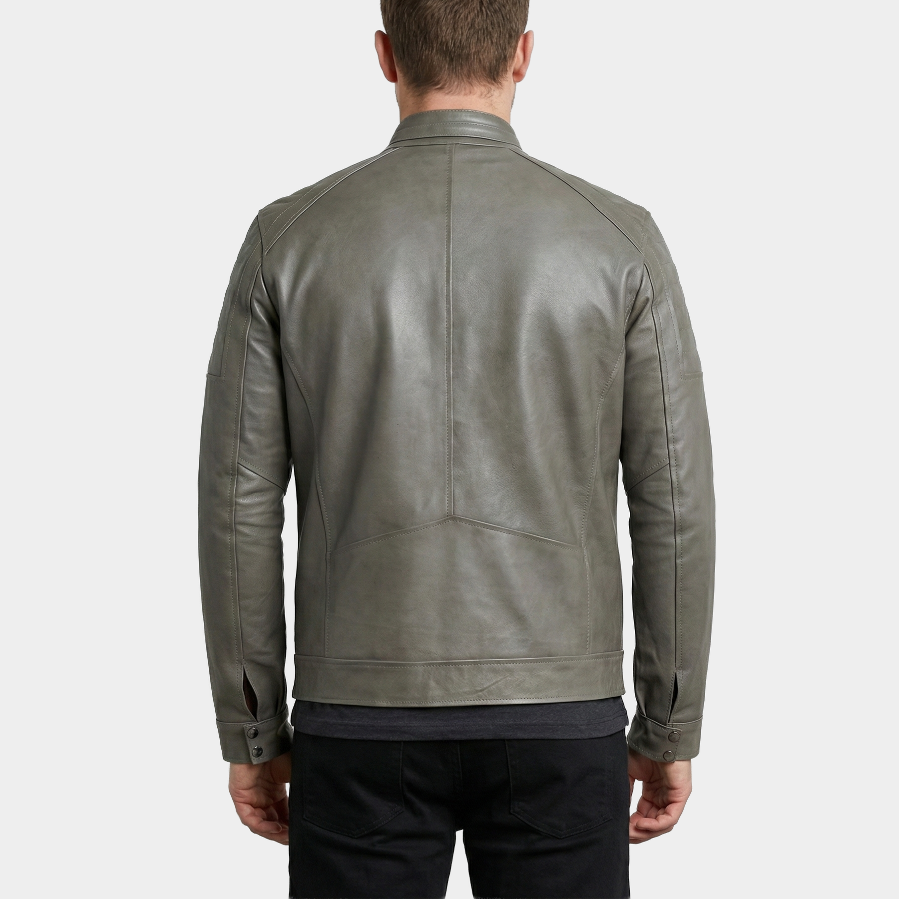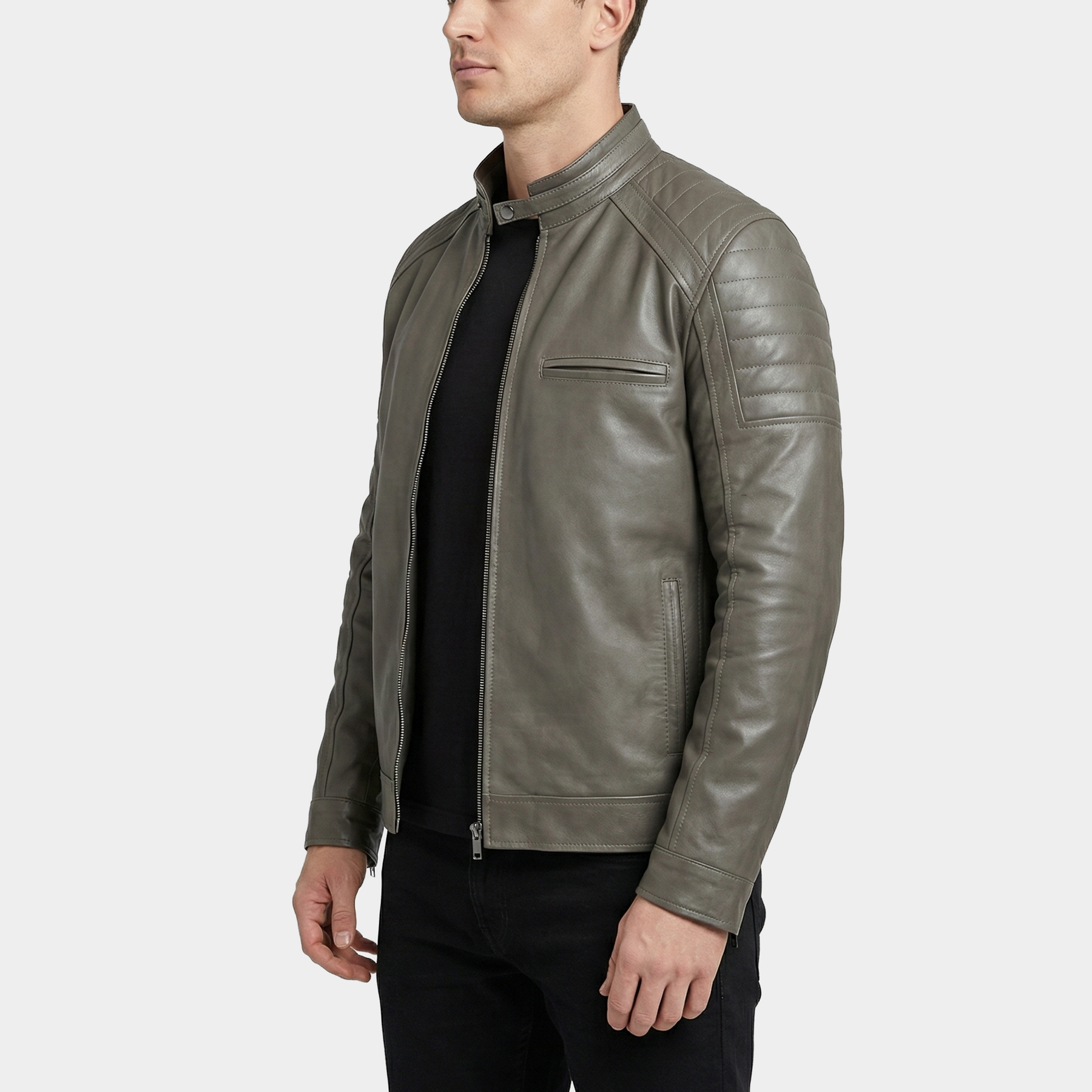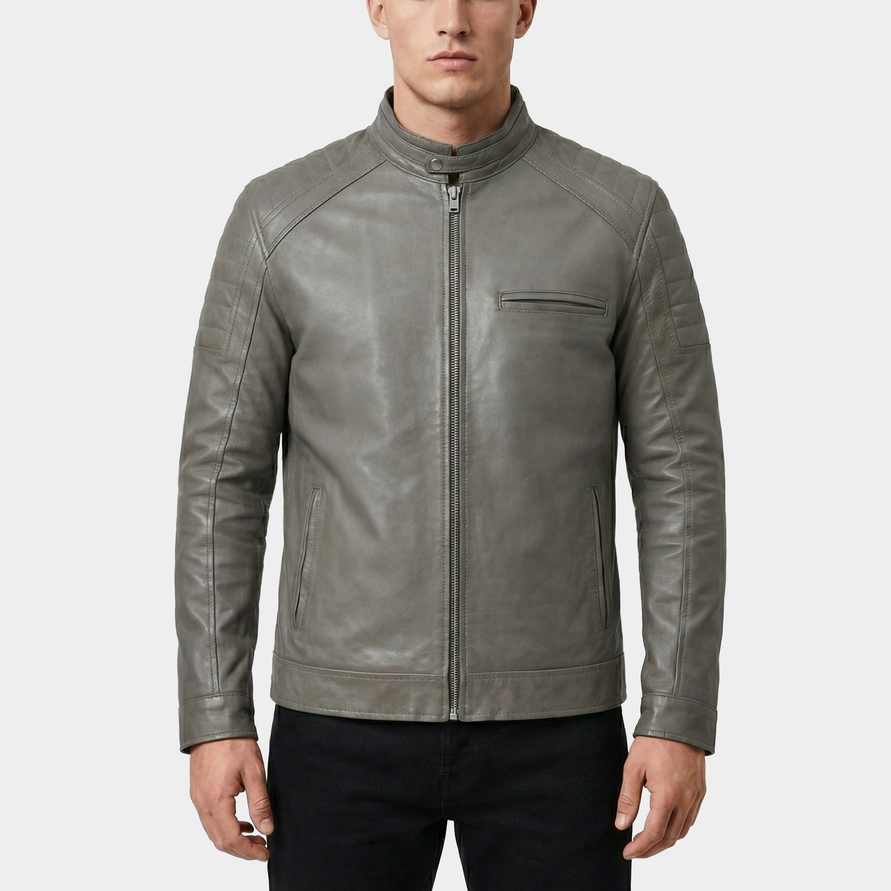 Jackson Grey Leather Biker Jacket Left Side Pose