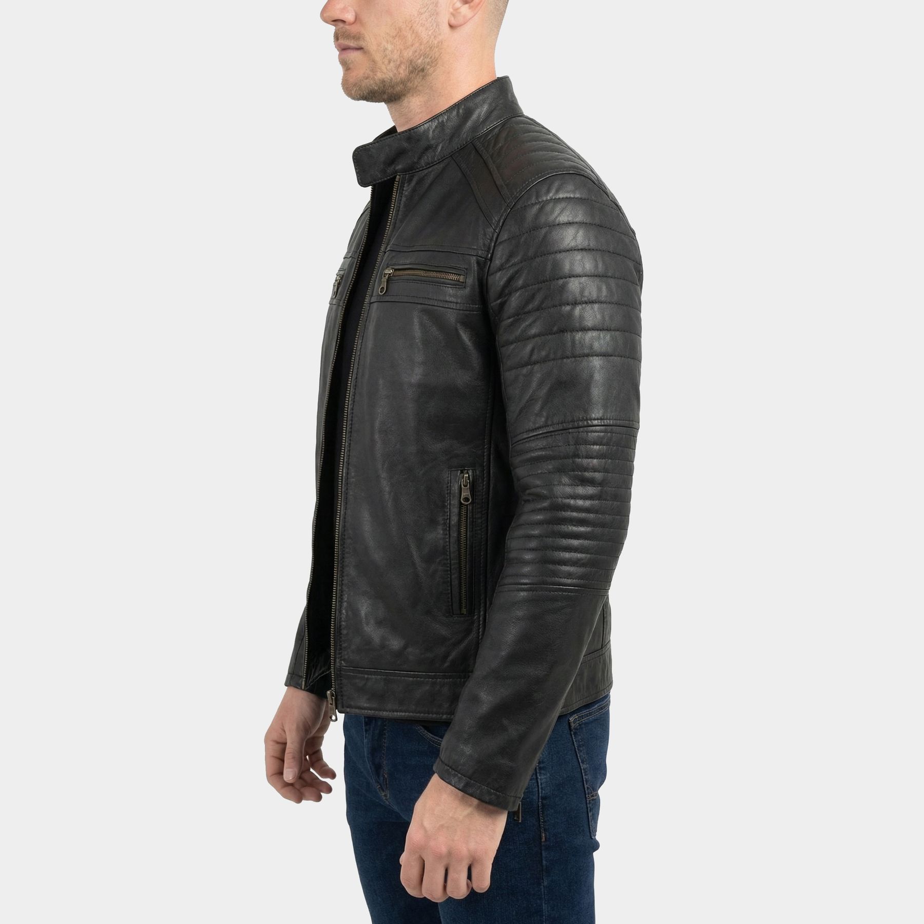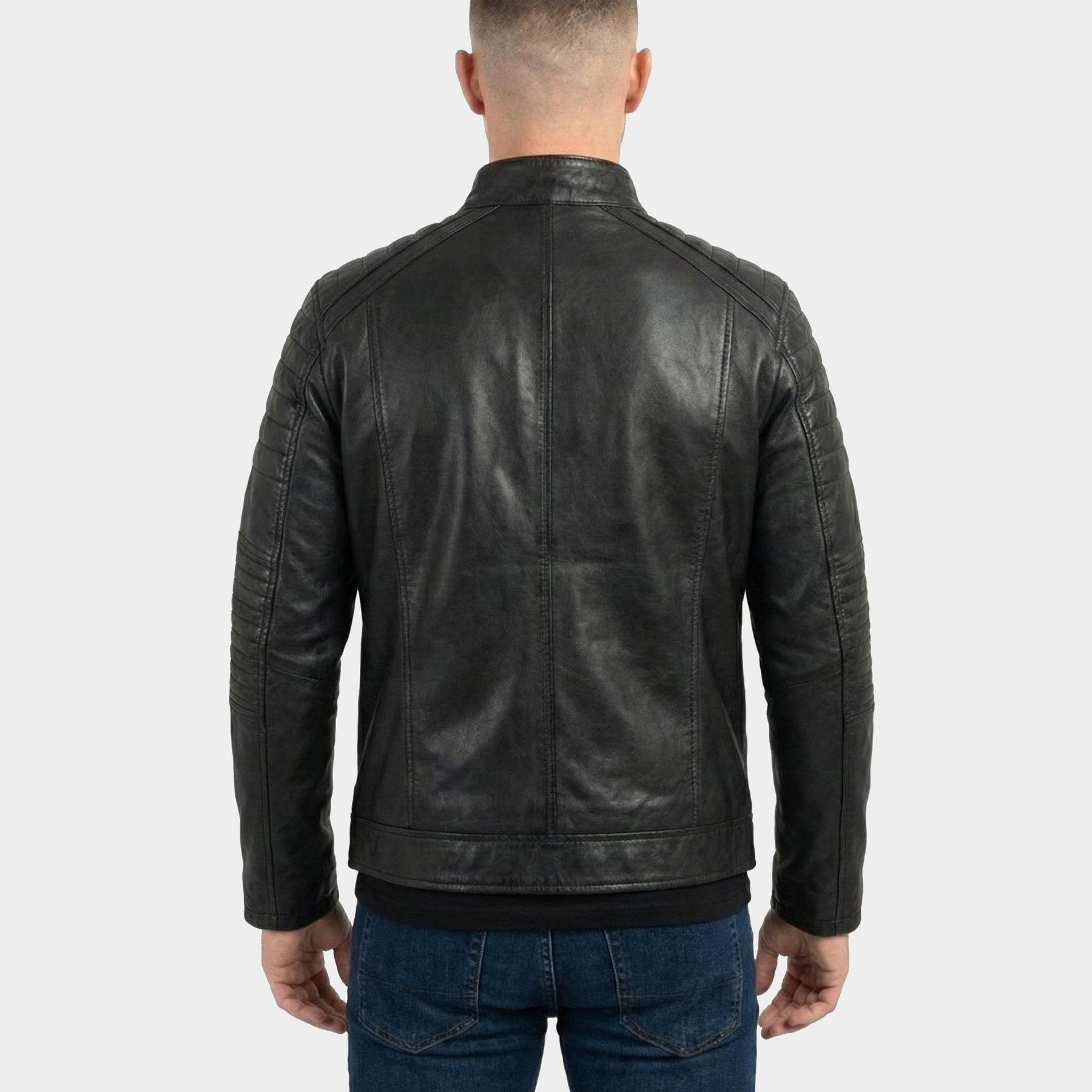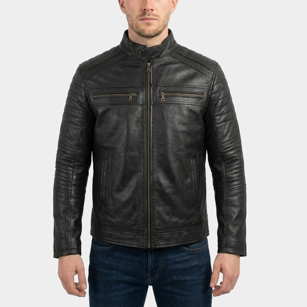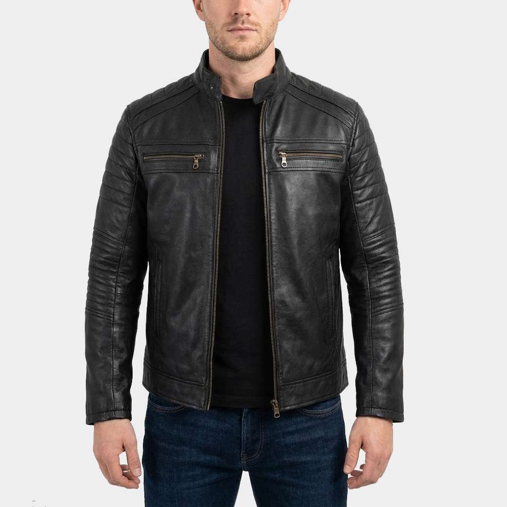 Design: Minimalist biker style with quilted shoulder & sleeve panels