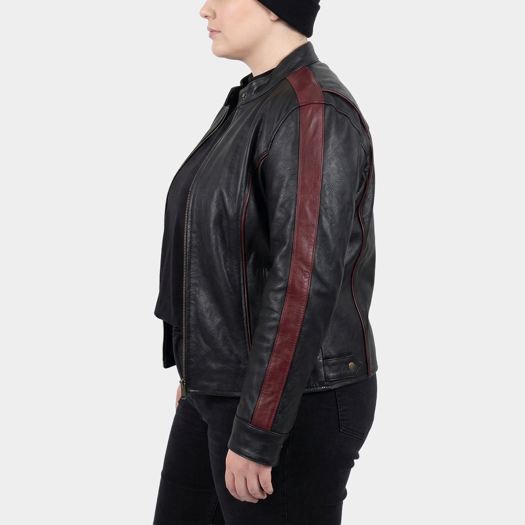 Design: Sleek cafe racer silhouette with contrast burgundy sleeve panels and curved seam detailing for a bold, modern look